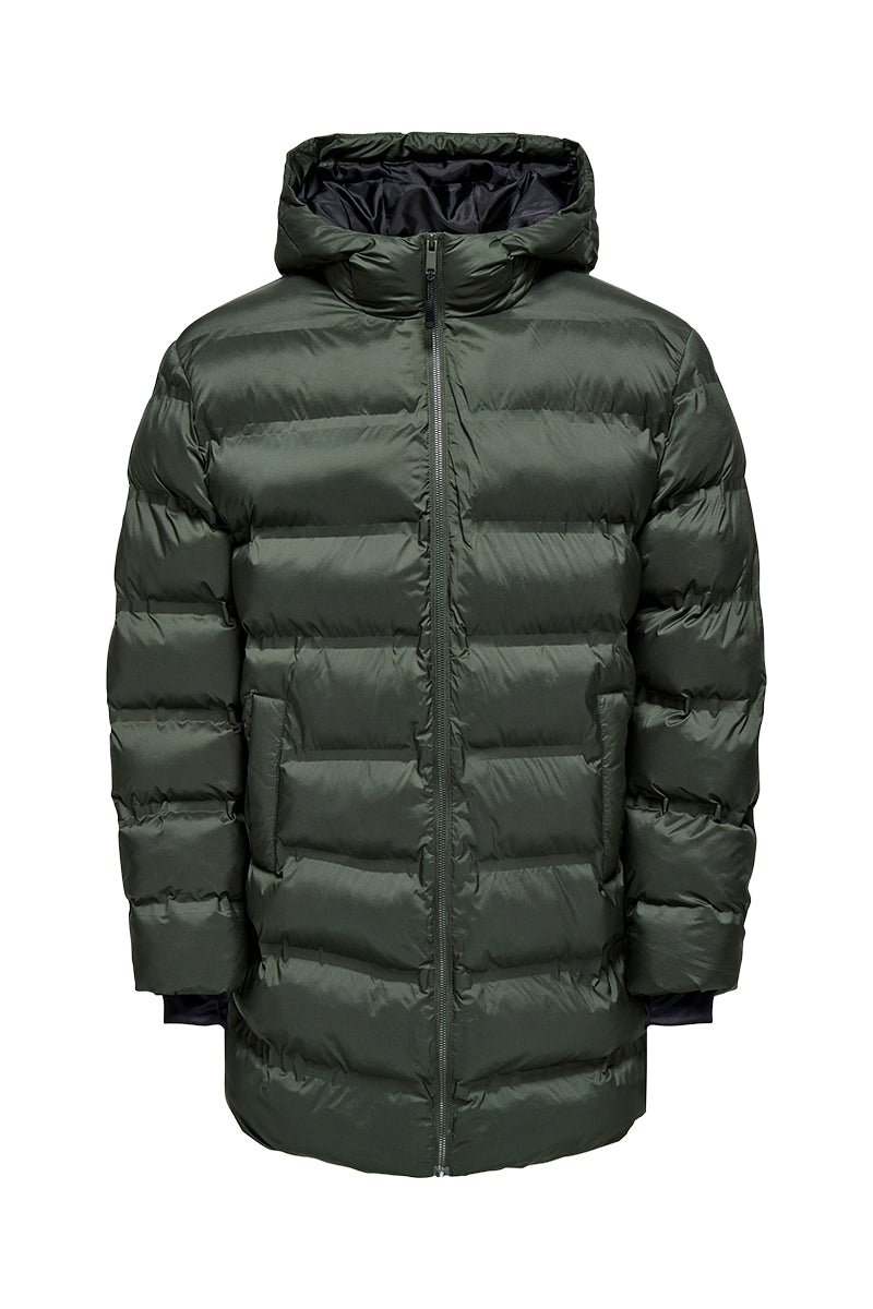 - Lange pufferjas met hoge kraag