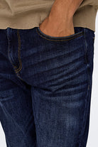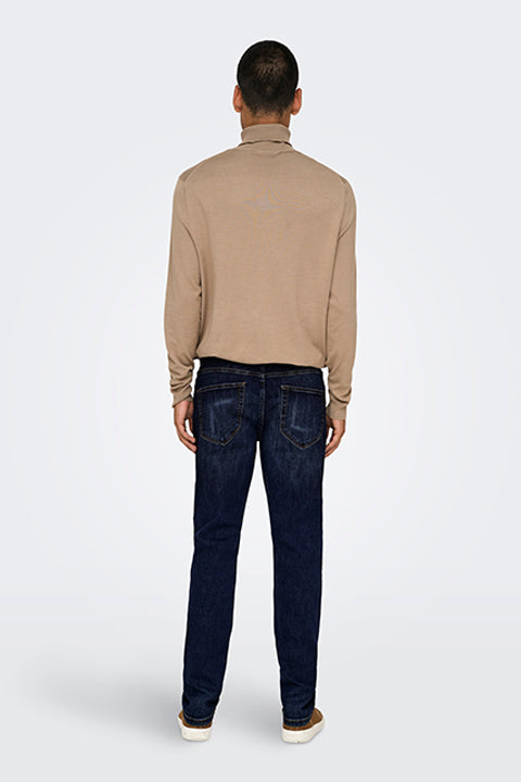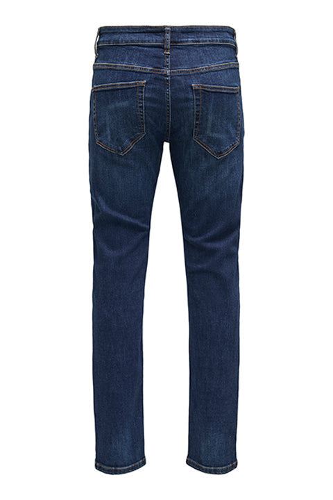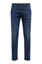 - Donkerblauwe jeans met ritssluiting in slim fit