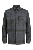 - Donkergrijze geruite overshirt met lange mouwen