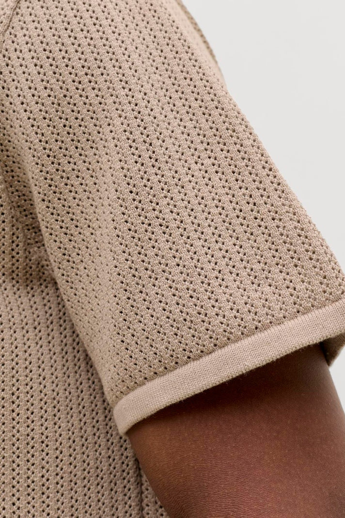 Deze knit polo met een split nek is gemaakt met een gestructureerde brei die een subtiele textuur geeft voor een exclusieve uitstraling. De uitvoering in een relaxte pasvorm en korte mouwen maakt het een comfortabele keuze voor het voorjaarsseizoen. De stof bestaat uit een mix van 60% biologisch katoen en 40% gerecycled polyester, wat zorgt voor duurzaamheid zonder in te leveren op comfort of stijl. De kleur, een zachte, lichte bruine toon genaamd String, past makkelijk bij verschillende outfits.