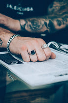 Northern Legacy ring in een zilvere kleur. Een gepolijste zilvere ring met een 14x14mm vierkant met een zwarte steen. De ring is 316L staall. Northern Legacy staat gegraveerd in de ring. Maten: Size 6 - 16,5 mm Size 7 - 17,3 mm Size 8 - 18,2 mm Size 9 - 18,9 mm Size 10 - 19,8 mmm Size 9 - 18,9 mm
