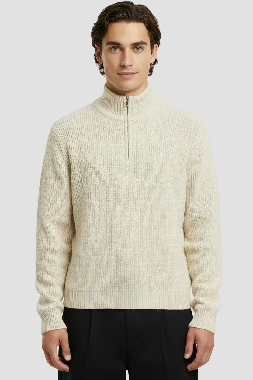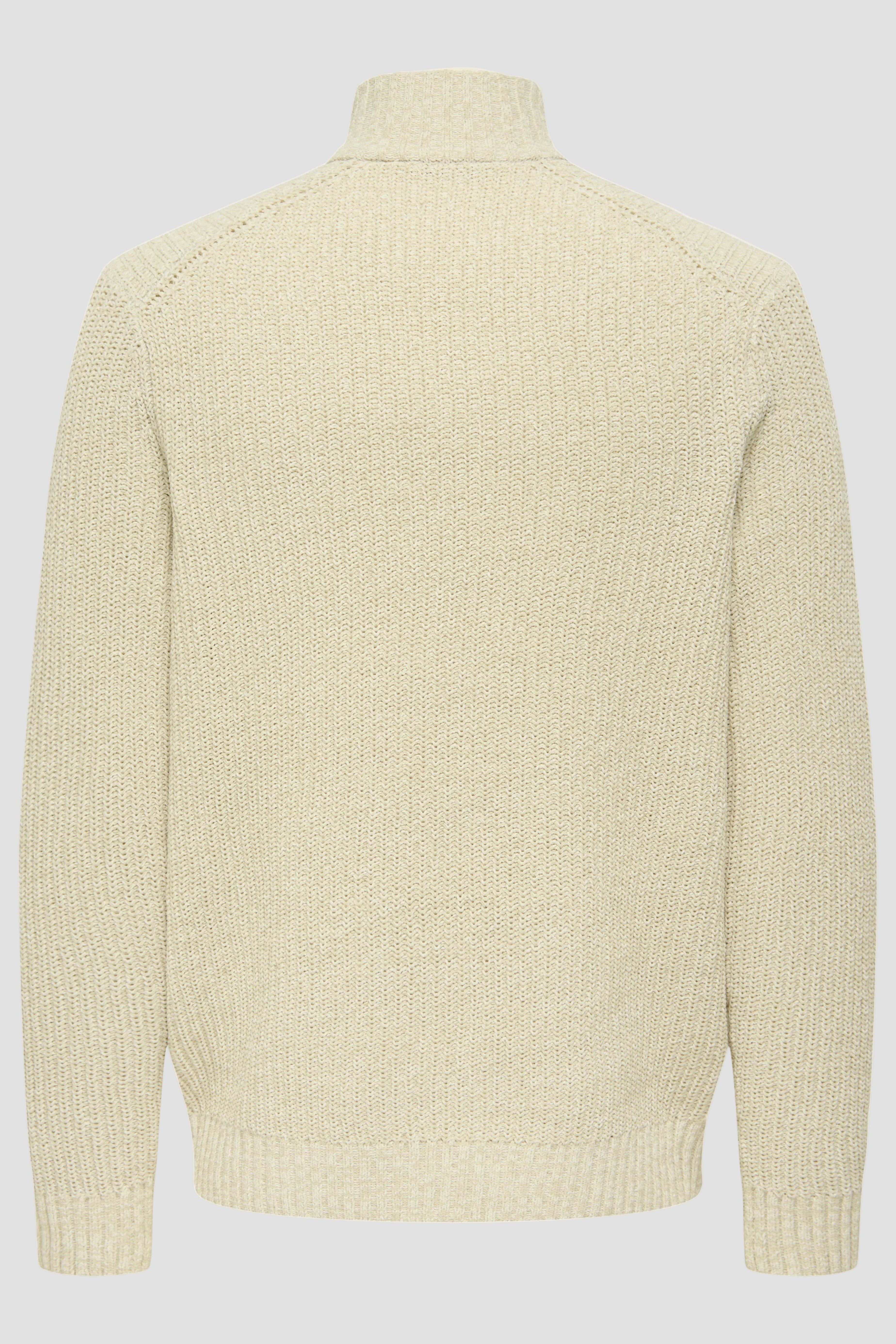 - Grof gebreide trui met hoge hals en halve rits