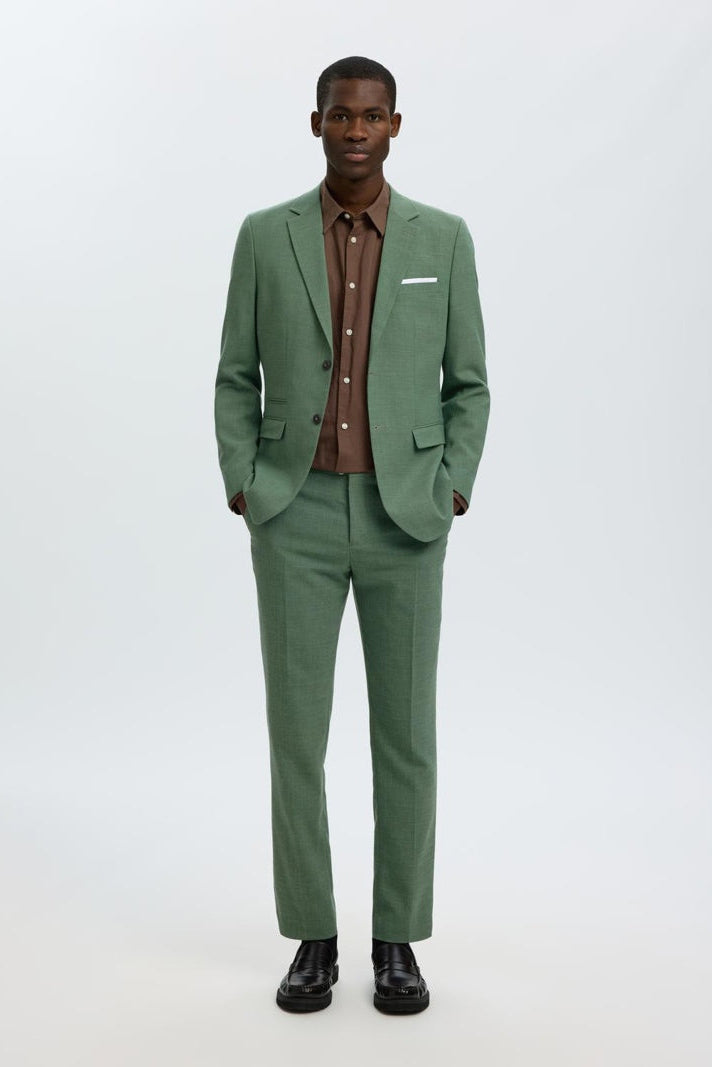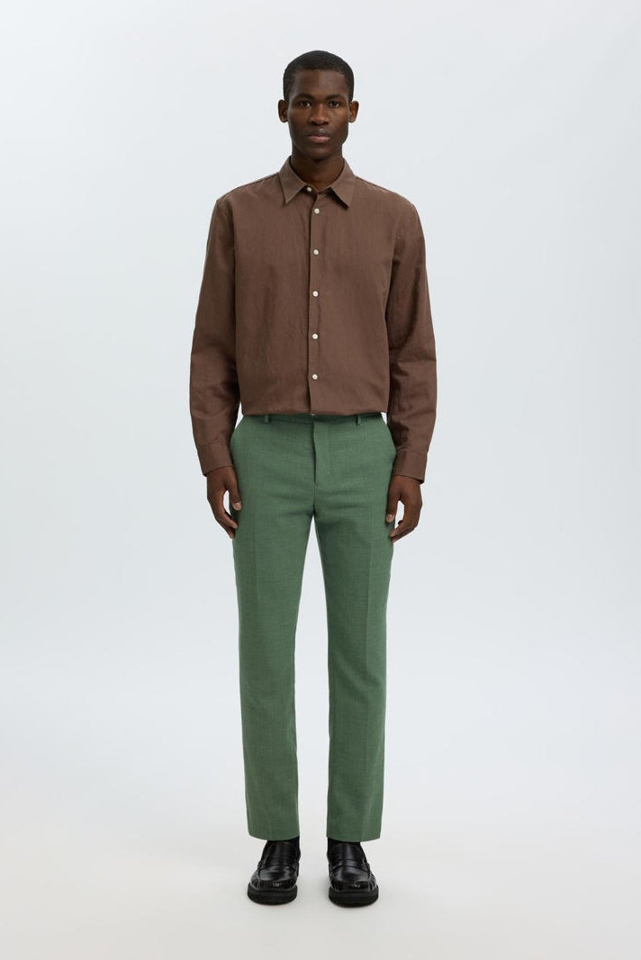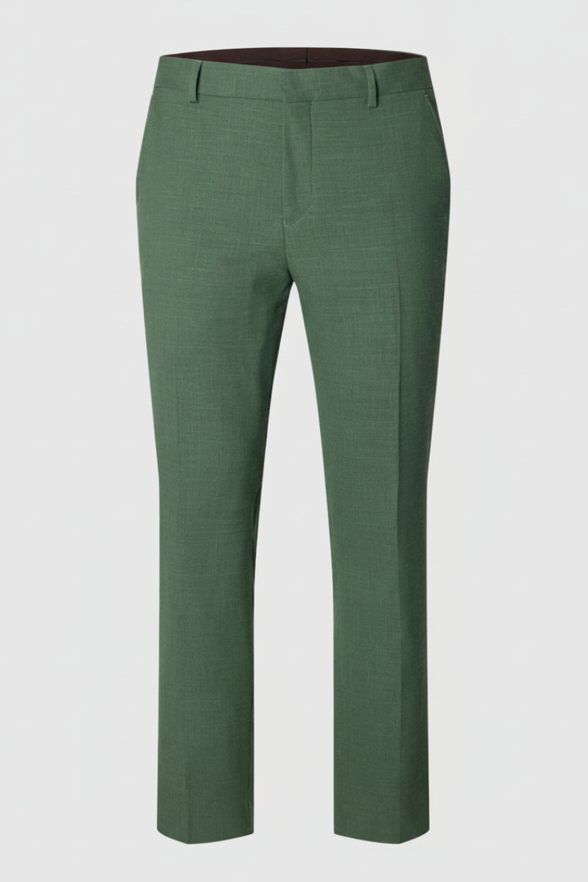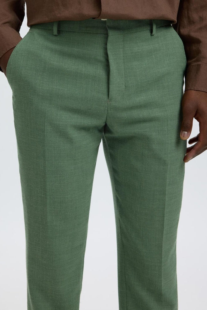 Deze slim fit linnen broek in oliemgroen combineert stijl met comfort en is ideaal voor formele gelegenheden. De broek heeft een nette, gestreken plooi en sluit met een knoop en rits, met praktische achter- en voorzakken. De mix van polyester, wol en linnen zorgt voor een soepel draaggevoel met een luxe uitstraling.